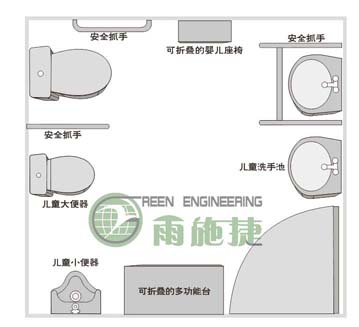 3、內部設施應包括成人坐便位、兒童坐便位、兒童小便位、成人洗手盆、兒童洗手盆、有嬰兒臺功能的多功能臺、兒童安全座椅、安全抓桿、掛衣鉤和呼叫器。