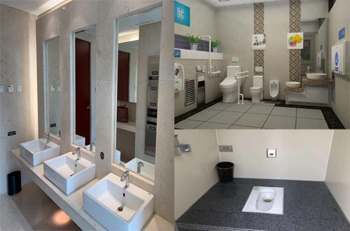 感應(yīng)水沖式蹲便器、不銹鋼扶手、衣帽鉤、整容鏡、不銹鋼手紙盒、廢紙桶、開門系統(tǒng)、有人/無人顯示裝置、排風(fēng)送風(fēng)系統(tǒng)。