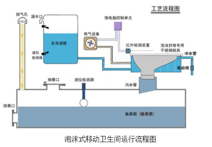 泡沫環保封堵廁所采用泡沫廁具結合無水生態廁所的處理工藝,采用微生物菌種消化降解技術處理大小便中的有機質,聯合脫色工藝生成達標水回沖廁所。廁所采取加熱及嚴格保溫的措施,處理效果不受環境溫度限制,-15~40攝氏度范圍內均可正常運行。