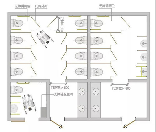 廁位:尺寸標(biāo)準(zhǔn)為2.0米X1.5米,不可小于1.8米X1.0米,面積不可小于4.0平方米。女廁無(wú)障礙設(shè)施:至少一個(gè)無(wú)障礙廁位,一個(gè)無(wú)障礙洗手盆。男廁所無(wú)障礙設(shè)施:至少一個(gè)無(wú)障礙廁位,一個(gè)無(wú)障礙小便器,一個(gè)無(wú)障礙洗手盆。