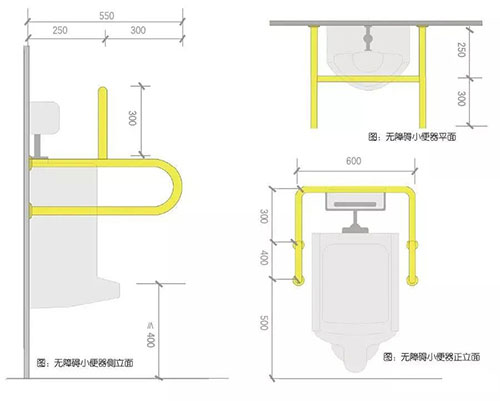 無(wú)障礙小便器:距離地面不能大于0.4米,在距離墻面0.25米安裝高度1.2米的垂直扶手,距離墻0.55米安裝水平扶手高度0.9米與垂直扶手連接成一個(gè)整體。