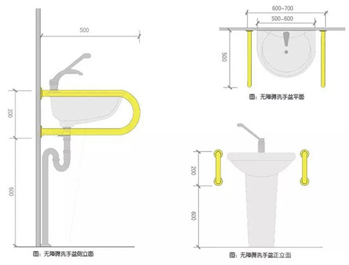 無(wú)障礙洗手盆:水嘴中點(diǎn)與墻距離大于0.55米,為了方便乘坐輪椅者的使用下面需預(yù)留出寬0.75×0.65×0.45米的空間。龍頭選用杠桿或感應(yīng)出水龍頭,洗手盆上方安裝鏡子方便整理儀容儀表。