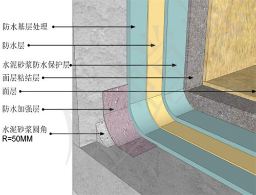 轉角部位做成圓弧形,陽角半徑宜大于1cm,陰角半徑宜大于5cm,可以使地面與墻在防水更好的融為一體,防止墻角滲水。