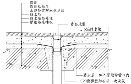 使用內嵌彈性密封材料或膨脹止水條將地漏與混凝土接口部分封閉,然后鋪貼一層0.3米寬的耐堿玻纖布或聚酯纖維無紡布做為附加層,搭接寬度不小于0.1米。地漏上口與原結構樓板平齊,衛生間防水層須伸入地漏內側3cm。