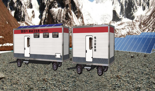 北京雨施捷公司為其量身定制了增加太陽能光伏發(fā)電系統(tǒng)的車載拖車式移動廁所。
